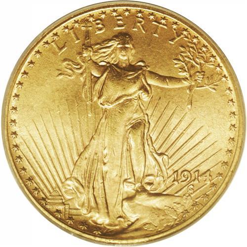 <B>1914 $20 MS63 PCGS.</B></I> A slightly better date from the Saint-Gaudens series. The surfaces are attractive for the modest grade, with minimal abrasions from bag handling. An average strike displays the uppermost devices.