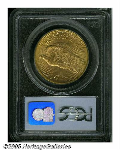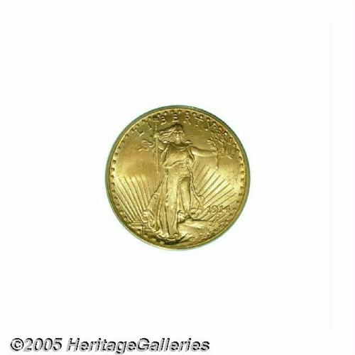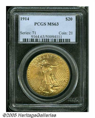 <B>1914<$20> MS63 PCGS.</B></I> Radiant peach and straw-gold colors endow this lustrous and reasonably preserved better date Double Eagle. The Capitol building is boldly impressed by the dies. The 1914 is popular with collectors, because of its production of just 95,250 pieces. To put that into perspective, the mintage is only a small fraction of the 1.2 million pieces struck of the famous 1914-D Cent rarity of the same date.