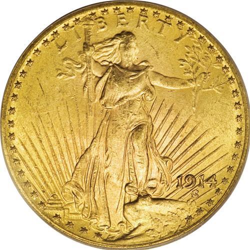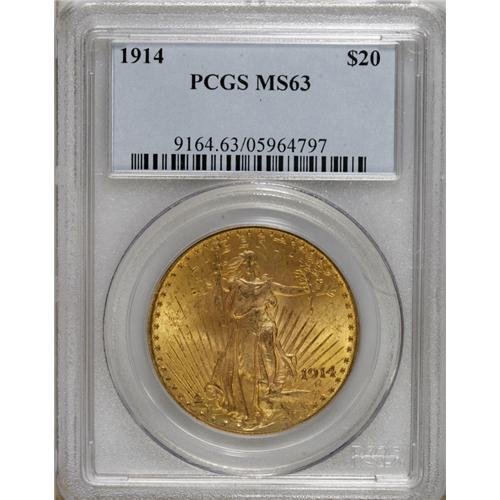 1914 $20 MS63 PCGS. The 1914 twenty dollar, with its 9