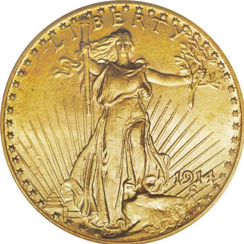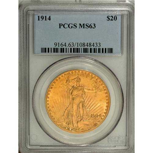 <B>1914 $20 MS63 PCGS.</B></I> This P-mint World War II-era issue has the lowest of its peers, at only 95,250 pieces. The present specimen offers attractive lemon-gold surfaces with good luster and a bold strike, but the abrasions typically found on Liberty's torso limit a finer grade.<BR><BR><b>Shipping:</b> Coin/Currency (<a target="_blank" href="http://www.heritageauctions.com/common/shipping.php">view shipping information</a>)