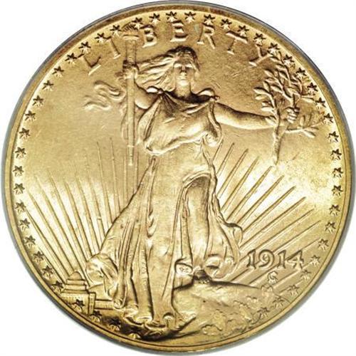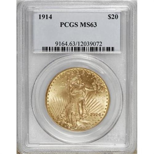 <B>1914 $20 MS63 PCGS.</B></I> This is a visually alluring Select Mint State double eagle, with shimmering luster and lovely straw-gold toning, imbued with pale khaki and rose highlights in the centers and near the peripheries. A few trivial marks are noted on each side. This issue is reasonably available at MS63 or MS64, but it immediately becomes rare any finer than the near-Gem level of preservation. <BR><BR><B>Coin Engraver:</B> Augustus Saint-Gaudens<BR><BR><b>Shipping:</b> Coins & Currency (<a target="_blank" href="http://www.heritageauctions.com/common/shipping.php">view shipping information</a>)