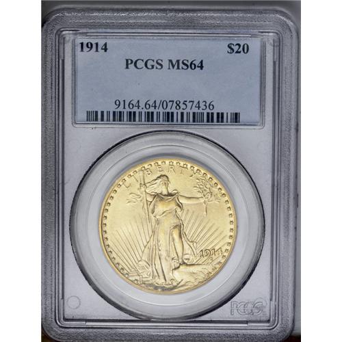 <B>1914<$20> MS64 PCGS.</B></I> An important date that is relatively available at this grade level, but essentially unavailable any finer, despite 36 Gems certified by PCGS. Less than 100,000 examples were originally coined. Unlike most, this example has satiny greenish-gold luster. The surfaces are excellent for the grade.