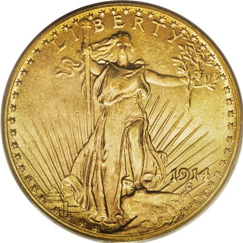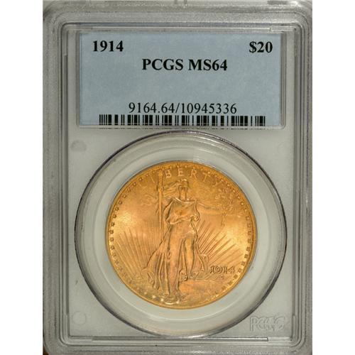 <B>1914 $20 MS64 PCGS.</B></I> An original mustard-gold near-Gem with comprehensive luster and a well preserved reverse. Suitably struck, and seldom seen any finer. The 1914 is popular because of its low mintage of 95,250 pieces, the lowest production Philadelphia issue of the type.<BR><BR><b>Shipping:</b> Coin/Currency (<a target="_blank" href="http://www.heritageauctions.com/common/shipping.php">view shipping information</a>)