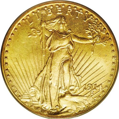 <B>1914<$20> MS64 PCGS.</B></I> Brightly lustrous with appealing lemon-yellow accents and few discernible surface marks. Faint spotting in the vicinity of the olive branch is likely the result of grease. The availability of 1914 Saints tapers off dramatically at the Choice level and only a few dozen Gems are known.