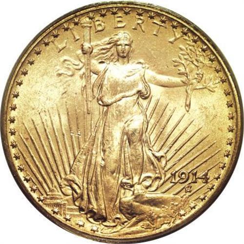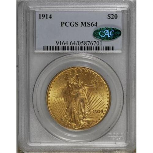 <B>1914 $20 MS64 PCGS. CAC.</B></I> This lovely orange-gold Choice Saint-Gaudens double eagle has a good strike and no singularly consequential abrasions. Luster rolls unencumbered across both fields. The lowest mintage business strike Philadelphia Mint Arabic Numerals issue, and widely accumulated as such.<BR><BR><B>Coin Engraver:</B> Augustus Saint-Gaudens<BR><BR><b>Shipping:</b> Coins & Currency (<a target="_blank" href="http://www.heritageauctions.com/common/shipping.php">view shipping information</a>)