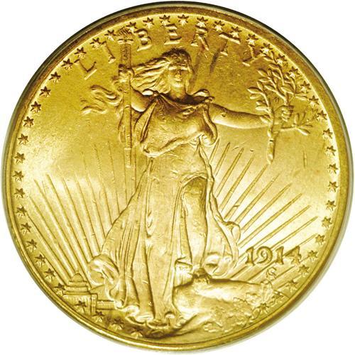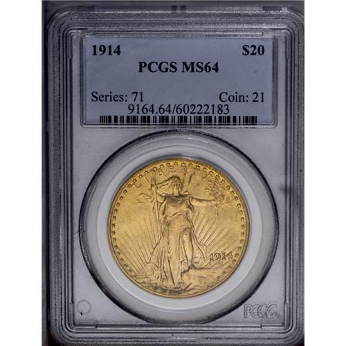 <B>1914<$20> MS64 PCGS.</B></I> Not an easy coin to find in this high a grade, the 1914 is somewhat scarce. Reddish-gold surfaces show a few small abrasions on Liberty's legs, as so often seen. But the strike is robust, and the satiny luster completes an appealing presentation. PCGS has graded 33 finer (3/06). <BR><BR><B>Important notice:</B> Heritage usually auctions material at the rate of 200-250 lots per hour. On some occasions eBay Live bid software or the Internet may not be able to keep up with the pace of the auction. We recommend placing a realistic absentee bid now as insurance to avoid disappointment. Occasionally the auctioneer may eliminate or reject an eBay Live bid, and the auctioneer may also reopen a lot after the close of the eBay live bidding (usually because we missed an audience bid), and may reject your bid even if it shows you as the winning bidder. By bidding via eBay Live, you agree that Heritage may award the lot to another bidder at its sole discretion under the circumstances described above or any other reasonable circumstances. Since eBay bids are not shown to us until we open the lot on the floor, we treat those bids just like floor bids. In most cases the floor responds before the eBay bid is presented to us, due to Internet lag time, so for consistency we have made it a policy that floor bids are always considered first over tie eBay live bids. Also please note that all Heritage lots purchased through eBay Live carry a 20% Buyer's Premium. Please make sure you read the Terms and Conditions before you bid. This lot is being auctioned in conjunction with a live floor auction by Heritage Galleries & Auctioneers. All final auction and invoice information will be supplied by Heritage Galleries & Auctioneers, and all other information should be considered preliminary. Lot:4635 <BR><BR><B>Winning Notification and Billing:</B> After the FINAL session in this auction is complete, Heritage will send e-mail and snail mail invoices. This process normally takes several days. All final auction and invoice information will be supplied by Heritage Galleries & Auctioneers, and all other information should be considered preliminary. <BR><BR>This auction will be conducted on a live auction floor and over the Internet through eBay Live. If you choose to place an absentee bid, please take a moment to <font color='#0000ff'><u><a href='http://pages.ebay.com/liveauctions/help/before/laabsentee.html'>learn how eBay Live absentee bidding works</a></u></font><font color='#000000'>