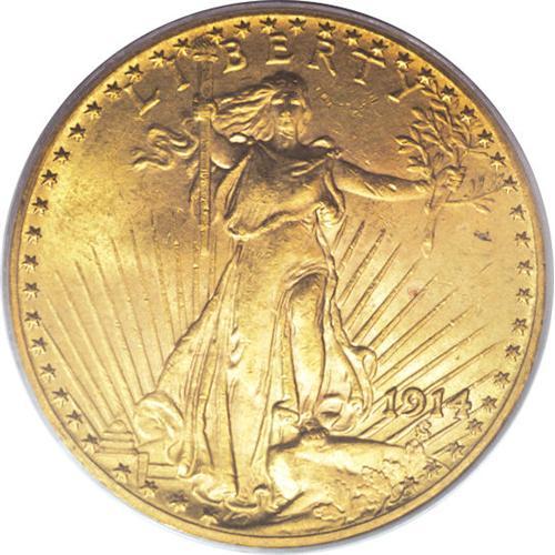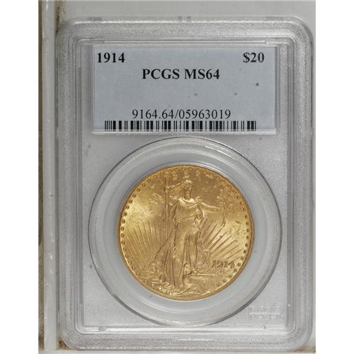 <B>1914 $20 MS64 PCGS.</B></I> Philadelphia Mint double eagles from the second decade of the 20th century are scarce, each from a low mintage. For example, this 1914 double eagle had a total production of just 95,250 coins. Like most, this example has a sharp strike and brilliant orange-gold luster. Finer examples are rare, with just 37 Gems certified by PCGS.<BR><BR><b>Shipping:</b> Coins & Currency (<a target="_blank" href="http://www.heritageauctions.com/common/shipping.php">view shipping information</a>)