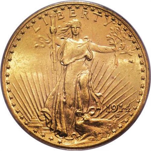 <B>1914 $20 MS64 PCGS.</B></I> Philadelphia Mint double eagles from the second decade of the 20th century are scarce, each from a low mintage. For example, this 1914 double eagle had a production of just 95,250 coins. Like most survivors, the present specimen has a sharp strike and brilliant orange-gold luster. Finer examples are rare, as PCGS has certified just 38 Gems (7/07).<BR><BR><B>Coin Engraver:</B> Augustus Saint-Gaudens<BR><BR><b>Shipping:</b> Coins & Currency (<a target="_blank" href="http://www.heritageauctions.com/common/shipping.php">view shipping information</a>\)