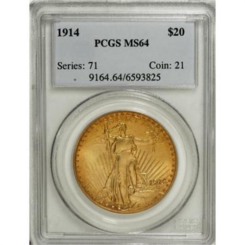 <B>1914 $20 MS64 PCGS.</B></I> This remarkable near-Gem has light green-gold color at the centers, surrounded by rich orange toning closer to the borders. The surfaces are satiny and the design elements are bold. A scarce date from a low mintage of just 95,200 coins, the 1914 is seldom founder any finer, with only 38 finer pieces certified by PCGS (6/07).<BR><I>From The Carlton Woods Collection.</B></I><BR><BR><B>Coin Engraver:</B> Augustus Saint-Gaudens<BR><BR><b>Shipping:</b> Coins & Currency (<a target="_blank" href="http://www.heritageauctions.com/common/shipping.php">view shipping information</a>\)