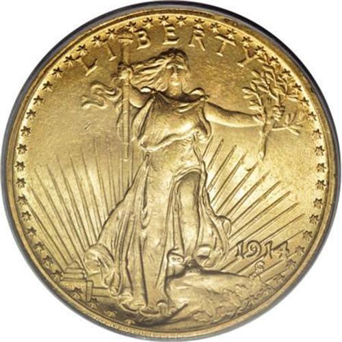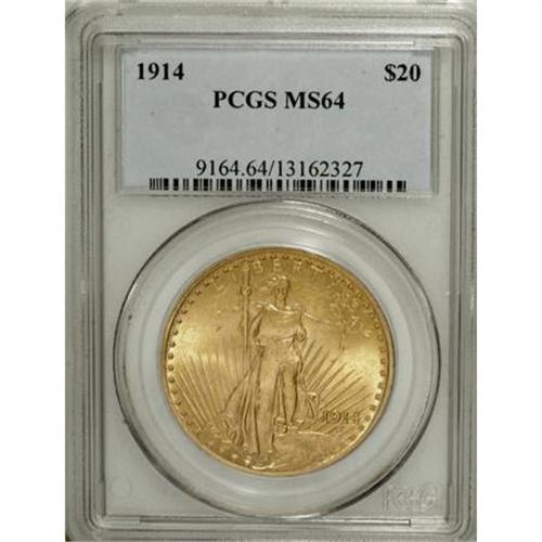 <B>1914 $20 MS64 PCGS.</B></I> Honey-gold patination is laced with wisps of light tan. Radiantly lustrous surfaces exhibit sharply struck design features, including the fingers on both hands and the eagle's plumage. A few minute marks are consistent with the grade designation. This issue becomes quite elusive any finer.<BR><I>From The Chicago Collection of Saints.</B></I><BR><BR><B>Coin Engraver:</B> Augustus Saint-Gaudens<BR><BR><b>Shipping:</b> Coins & Currency (<a target="_blank" href="http://www.heritageauctions.com/common/shipping.php">view shipping information</a>)