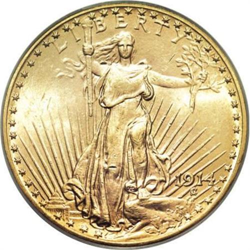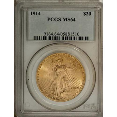 <B>1914 $20 MS64 PCGS.</B></I> The 1914 is a slightly better date in the Saint-Gaudens series, and one that becomes quite elusive at the Gem grade level, where only about six dozen have been graded at NGC and PCGS combined. This piece offers excellent luster radiating from the apricot-gold surfaces, although a few stray marks preclude the Gem grade.<BR><BR><B>Coin Engraver:</B> Augustus Saint-Gaudens<BR><BR><b>Shipping:</b> Coins & Currency (<a target="_blank" href="http://www.heritageauctions.com/common/shipping.php">view shipping information</a>)