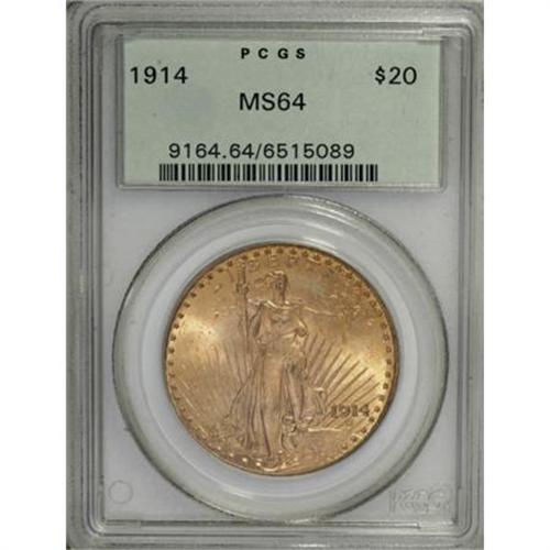 <B>1914 $20 MS64 PCGS.</B></I> This issue is one of the scarcest among the early Philadelphia rarities in the Saint-Gaudens series. Housed in a green-label holder, this near-Gem is lightly abraded with a few scattered marks that are entirely consistent with the grade. PCGS has certified 39 finer examples (1/08).<BR><BR><B>Coin Engraver:</B> Augustus Saint-Gaudens<BR><BR><b>Shipping:</b> Coins & Currency (<a target="_blank" href="http://www.heritageauctions.com/common/shipping.php">view shipping information</a>)