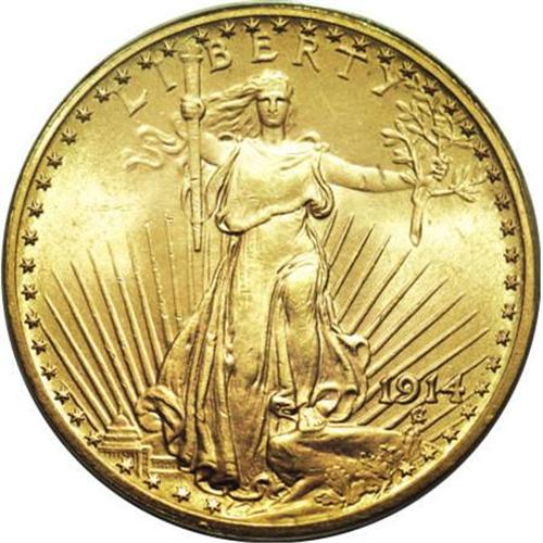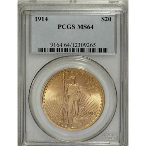 <B>1914 $20 MS64 PCGS.</B></I> This alluring near-Gem displays soft, shimmering mint frost and elegant antique-gold and rose toning. A few superficial marks keep it from Gem status. This Philadelphia Mint issue was well produced, according to the <I>Encyclopedia of U.S. Gold Coins 1795-1933, </B></I>unlike the 1913 pieces which were weakly produced. Survivors are still rare any finer than MS64, however.<BR><BR><B>Coin Engraver:</B> Augustus Saint-Gaudens<BR><BR><b>Shipping:</b> Coins & Currency (<a target="_blank" href="http://www.heritageauctions.com/common/shipping.php">view shipping information</a>)
