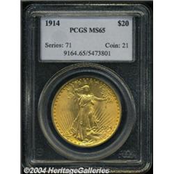 <table><tbody><tr><td><table> <TR><TD width="100%"><TABLE cellSpacing=1 cellPadding=3 width="100%" border=0><TBODY><TR><TD width="100%" bgColor=#79735c><FONT face=arial color=#ffffff size=3><B>Description</B> </FONT></TD></TR><TR><TD width="100%" bgColor=#ffffff><FONT face=arial size=2><B>1914 $20 MS65 PCGS.</B></I> The high grade rarity of this issue is such that NGC and PCGS combined have certified only 28 coins in MS 65, and there are a mere two MS 66 PCGS specimens finer (11/03). In lower grades, the 1914 compares favorably to the 1911 and 1915, but at the present level it outstrips both issues in terms of rarity. This is the first Gem quality 1914 double eagle that we have handled in over three years, and it is a simply stunning coin. The luster quality and striking detail are equally free of criticism, and both sides are awash in rich orange-gold color that is suggestive of originality. Only a few tiny abrasions are seen on each side, these being the grade-limiting factors. One of only 95,320 pieces produced. Population: 21 in 65, 2 finer (10/03).<BR><I>From a Magnificent Collection of Double Eagles.</B></I> </FONT></TD></TR></TBODY></TABLE></TD></TR></TBODY></TABLE><BR><A name=PricesRealized></A><TABLE cellSpacing=0 cellPadding=0 width="100%" bgColor=#000000 border=0><TBODY><TR><TD width="100%"><TABLE cellSpacing=1 cellPadding=3 width="100%" border=0><TBODY><TR><TD width="100%" bgColor=#79735c><A name=PR><FONT face=arial color=#ffffff size=3><B>Previous Prices from Heritage Auctions</B> </FONT></A></TD></TR><TR><TD bgColor=#f6f6ed><TABLE cellSpacing=0 cellPadding=0 width="100%" border=1><TBODY><TR><TD align=middle width="33%"><B>Date</B></TD><TD align=middle width="33%"><B>Service</B></TD><TD align=middle width="33%"><B>Price</B></TD></TR><TR bgColor=whitesmoke><TD width="33%"><B>12/01/1996</B></TD><TD width="33%">NGC</TD><TD width="33%">$9,075.00</TD></TR></TBODY></TABLE></TD></TR><TR><TD bgColor=#ffffff><FONT face=arial size=1 ?>PLEASE NOTE: All prices realized reflect the final hammer price PLUS the buyer's premium in auctions that charge a buyer's premium. Each item has a notation at the top of the listing indicating whether that lot included a buyer's premium. Example: A item that sells with a final hammer price of $100 and a 20% buyer's premium will display with a price realized of $120. All information listed is intended to be as accurate as possible, but errors are possible. Please use this guide carefully and inform us of any inaccuracies. </FONT></TD></TR></TBODY></TABLE></TD></TR></TBODY></TABLE><BR><TABLE cellSpacing=0 cellPadding=0 width="100%" bgColor=#000000 border=0><TBODY><TR><TD width="100%"><TABLE cellSpacing=1 cellPadding=3 width="100%" border=0><TBODY><TR><TD width="100%" bgColor=#79735c colSpan=6><FONT face=arial color=#ffffff size=3><B>Price Guide*</B> </FONT></TD></TR><TR bgColor=#f6f6ed><TD align=middle><B>Grade</B> </TD><TD align=middle><B>Coin World<BR>(Trends)</B> </TD><TD align=middle><B>Numismedia<BR>Retail</B> </TD><TD align=middle><B>Numismedia<BR>Wholesale</B> </TD><TD align=middle><B>Coin<BR>Universe</B> </TD><TD align=middle><B>Heritage<BR>Value Index</B> </TD></TR><TR bgColor=#ffffff><TD align=middle>64</TD><TD align=right>$4,000.00</TD><TD align=right>---</TD><TD align=right>$2,175.00</TD><TD align=right>$3,500.00</TD><TD align=right>$2,869.75</TD></TR><TR style="FONT-WEIGHT: bold" bgColor=#cccfdd><TD align=middle>65</TD><TD align=right>$17,000.00</TD><TD align=right>---</TD><TD align=right>$12,150.00</TD><TD align=right>$17,000.00</TD><TD align=right>$11,563.33</TD></TR><TR bgColor=#ffffff><TD align=middle>66</TD><TD align=right>---</TD><TD align=right>---</TD><TD align=right>---</TD><TD align=right>---</TD><TD align=right>$32,500.00</TD></TR><TR bgColor=#ffffff><TD colSpan=6><FONT size=1>*All information listed is intended to be as accurate as possible, but errors are possible. No item may be returned or refused based on this information which is provided as a service to our customers. You should contact each pricing source directly to determine the accuracy of this information. </FONT></TD></TR></TBODY></TABLE></TD></TR></TBODY></TABLE><BR><TABLE cellSpacing=0 cellPadding=0 width="100%" bgColor=#000000 border=0><TBODY><TR><TD width="100%"><TABLE cellSpacing=1 cellPadding=3 width="100%" border=0><TBODY><TR><TD width="100%" bgColor=#79735c><FONT face=arial color=#ffffff size=3><B>Population Guide</B> </FONT></TD></TR><TR bgColor=#ffffff><TD align=middle><!-- Begin Output of Population Grid--><TABLE cellSpacing=0 cellPadding=0 width="100%" border=0><TBODY><TR><TD vAlign=center><TABLE cellSpacing=0 width="100%" border=1 cellsadding="3"><TBODY><TR><TD vAlign=center><TABLE cellSpacing=0 cellPadding=3 width="100%" border=1><TBODY><TR><TD vAlign=center align=middle bgColor=#f0f1e8 colSpan=2 <CENTER><FONT face=Arial size=2><B>PCGS Pop </B></FONT><CENTER></CENTER></TD><TD vAlign=center align=middle bgColor=#f0f1e8 colSpan=2><CENTER><FONT face=Arial size=2><B>NGC Pop</B></CENTER></FONT></TD></TR><TR><TD vAlign=center><FONT face=Arial size=2>(65)</FONT> </TD><TD vAlign=center align=right><FONT face=Arial size=2>21</FONT> </TD><TD vAlign=center><FONT face=Arial size=2>(65)</FONT> </TD><TD vAlign=center align=right><FONT face=Arial size=2>7</FONT> </TD></TR><TR><TD vAlign=center><FONT face=Arial size=2>(>65)</FONT> </TD><TD vAlign=center align=right><FONT face=Arial size=2>2</FONT> </TD><TD vAlign=center><FONT face=Arial size=2>(>65)</FONT> </TD><TD vAlign=center align=right><FONT face=Arial size=2>0</FONT> </TD></TR></TBODY></TABLE></TD></TR></TBODY></TABLE></TD></TR></TBODY></TABLE><!-- End Output of Population Grid--></TD></TR></TBODY></TABLE></TD></TR></TBODY></TABLE><BR><TABLE cellSpacing=0 cellPadding=0 width="100%" bgColor=#000000 border=0><TBODY><TR> <font color='#000000'><span style='background-color: #FFFFFF'><td bgcolor='#FFFFFE'> Important notice: Heritage usually auctions material at the rate of 200-250 lots per hour. On some occasions eBay L