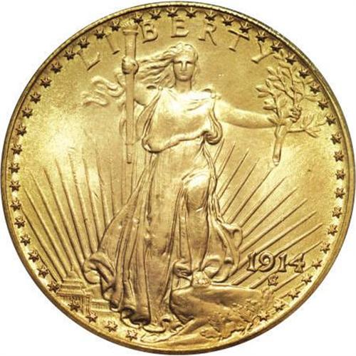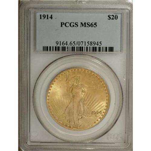 <B>1914 $20 MS65 PCGS.</B></I> Originality reigns supreme on this well preserved, low mintage 1914 double eagle. It is as if this coin was carefully stored the day it was struck and left alone until making its way into a PCGS holder at the Gem level. When specialists of this series speak of "skin" on original, unmolested examples, this is what they are talking about. If one makes an exerted effort, the slightest interruption of luster can be located in the left obverse field. Other than that and a tiny tick on Liberty's left knee, this coin appears flawless and is physical proof that not all MS65 Saint-Gaudens twenties are of the same quality. A conservatively graded piece that will surely draw the careful attention of collectors and dealers alike. Population: 36 in 65, 3 finer (12/07).<BR><BR><B>Coin Engraver:</B> Augustus Saint-Gaudens<BR><BR><b>Shipping:</b> Coins & Currency (<a target="_blank" href="http://www.heritageauctions.com/common/shipping.php">view shipping information</a>)