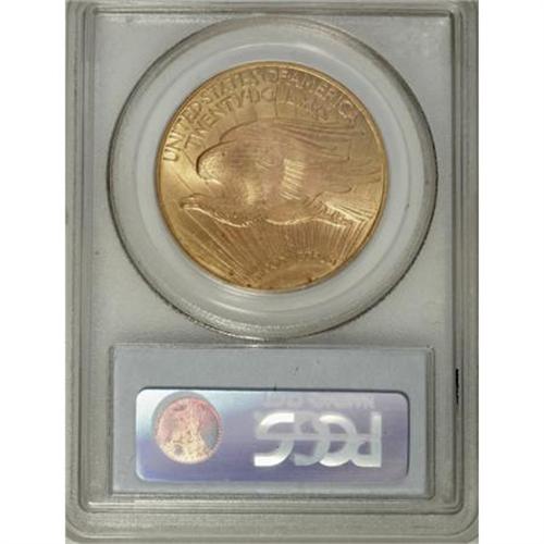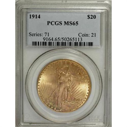 <B>1914 $20 MS65 PCGS.</B></I> The 1914 Saint-Gaudens issue is one of the many series entries that confirm that there is absolutely no relation between the initial mintage figures and the subsequent survival rates. Hoarding, exporting, repatriation, mass meltings, and happenstance have all played major roles in the survivorship of one issue over another. In the case of the 1914 twenty, while only 95,200 coins were produced, judging from the population figures it appears as though somewhere from 6% to 10% of that original mintage survives today, including both certified and "raw" specimens. <BR> As of (3/08) PCGS has certified 36 Gems including the present example, with three pieces finer. Intermingled greenish-gold and hazel-gray combine delightfully on both sides of this Gem, with wonderful luster radiating from distraction-free surfaces.<BR><BR><B>Coin Engraver:</B> Augustus Saint-Gaudens<BR><BR><b>Shipping:</b> Coins & Currency (<a target="_blank" href="http://www.heritageauctions.com/common/shipping.php">view shipping information</a>)