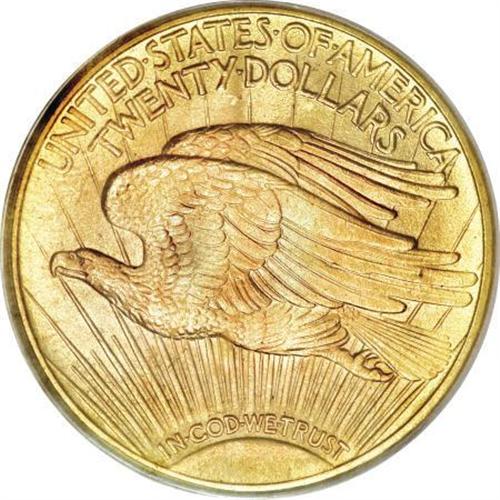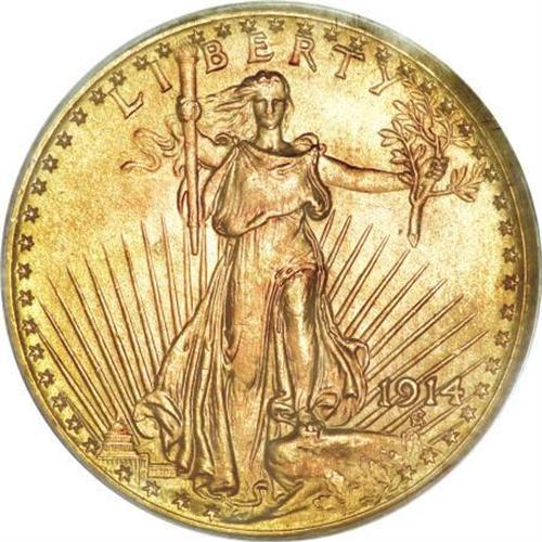 <B>1914 $20 MS66 PCGS.</B></I> Ex: Duckor. The five-figure mintage of the 1914 double eagle may hint at rarity, but in most grades, this issue is readily available. Like a number of other Philadelphia double eagles, the 1914 is a hoard date, with repatriated pieces predominating on the market. Though the lesser Mint State grades are more heavily populated now than they were decades ago, as recounted by Akers and other gold experts, the overall rarity of better coins, such as Gems and Premium Gems, has changed little. While pieces kept safely in collectors cabinets were comparably immune to grade-lowering effects, the same cannot be said for the hoard coins, which often show mild to moderate abrasions from transportation and storage that was often rough and careless. This leads to the supposition that the present piece was cared for by a conscientious numismatist long before it caught the eye of its most famous owner. <BR> This is a truly remarkable example that resides at the pinnacle of the Condition Census for the 1914. In fact, the combined certified population shows just four Premium Gems, with none finer at either service (11/07). A soft, variegated mixture of orange-gold and green-gold patina over each side greets the viewer, and is, perhaps, this coin's strongest attribute. The strike is razor sharp throughout with excellent definition on the torch, Liberty's fingers, the olive branch, and the cluster of oak leaves under the date. The virtually unmarked surfaces are frosty with a coruscant, matte-like finish. A cluster of tiny marks is seen on Liberty's left (facing) thigh and can serve as a future identifier for this eminently appealing example.<BR><I>From The Jacob Collection of Saint-Gaudens Double Eagles.</B></I><BR><BR><B>Coin Engraver:</B> Augustus Saint-Gaudens<BR><BR><b>Shipping:</b> Coins & Currency (<a target="_blank" href="http://www.heritageauctions.com/common/shipping.php">view shipping information</a>)
