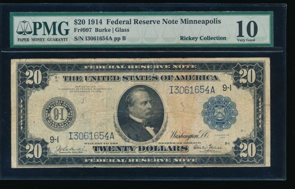 One 1914 $20 Minneapolis Federal Reserve Note PMG 10.