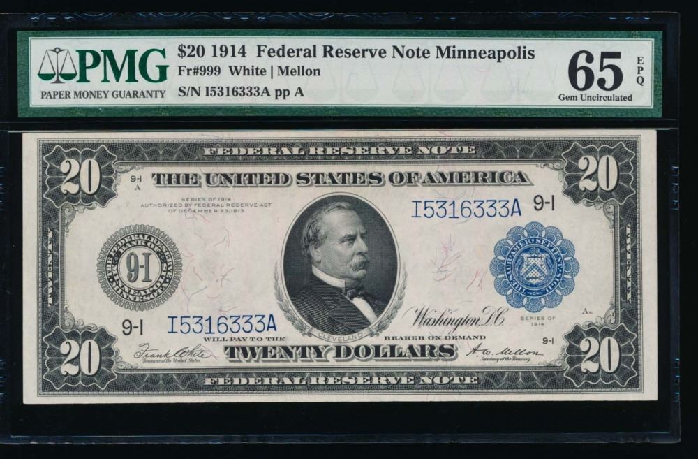 One 1914 $20 Minneapolis Federal Reserve Note PMG 65EPQ.