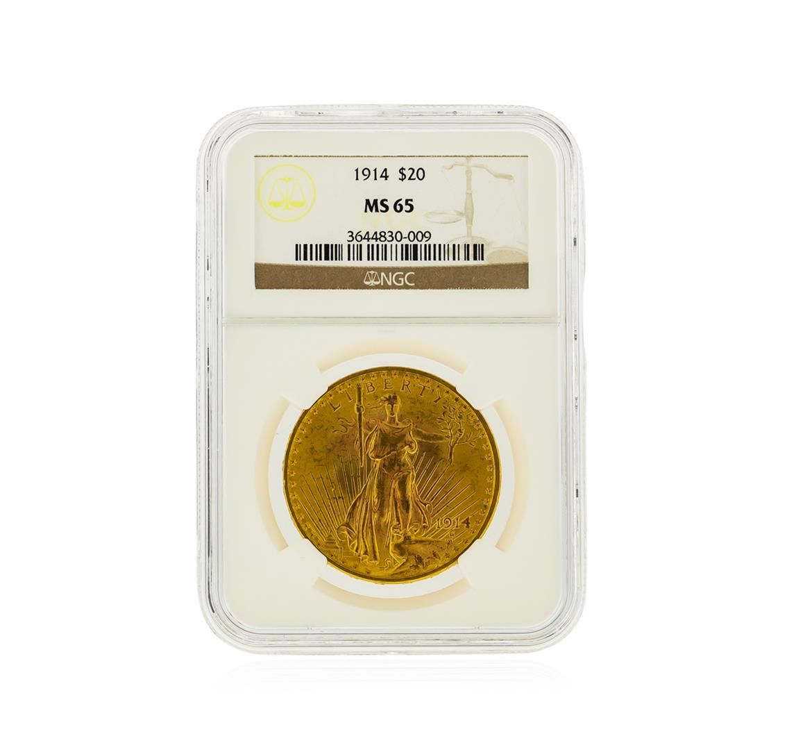 One 1914 $20 St. Gaudens Double Eagle Gold Coin NGC Graded MS65. The 1914 has the lowest mintage figure of any of the underrated and scarce Philadelphia Mint coins. The 1914 is an excellent example and is very well struck. NGC Certified.