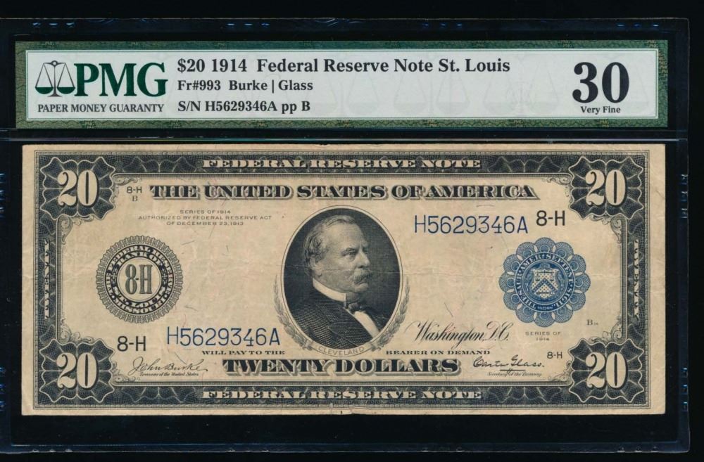 One 1914 $20 St Louis Federal Reserve Note PMG 30.