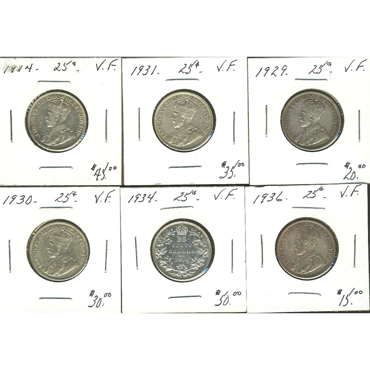 1914 25¢, 1917, 1918, 1919 & 1936. Lot of 5 coins all Abt EF. (PBA).