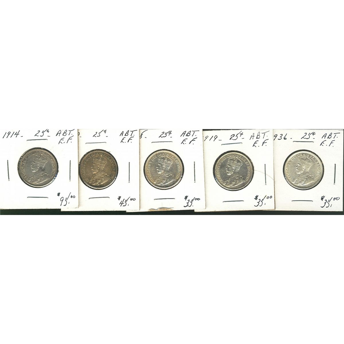 1914 25¢, 1929, 1930, 1931, 1934 & 1936. Lot of 6 coins all VF. (PBA).