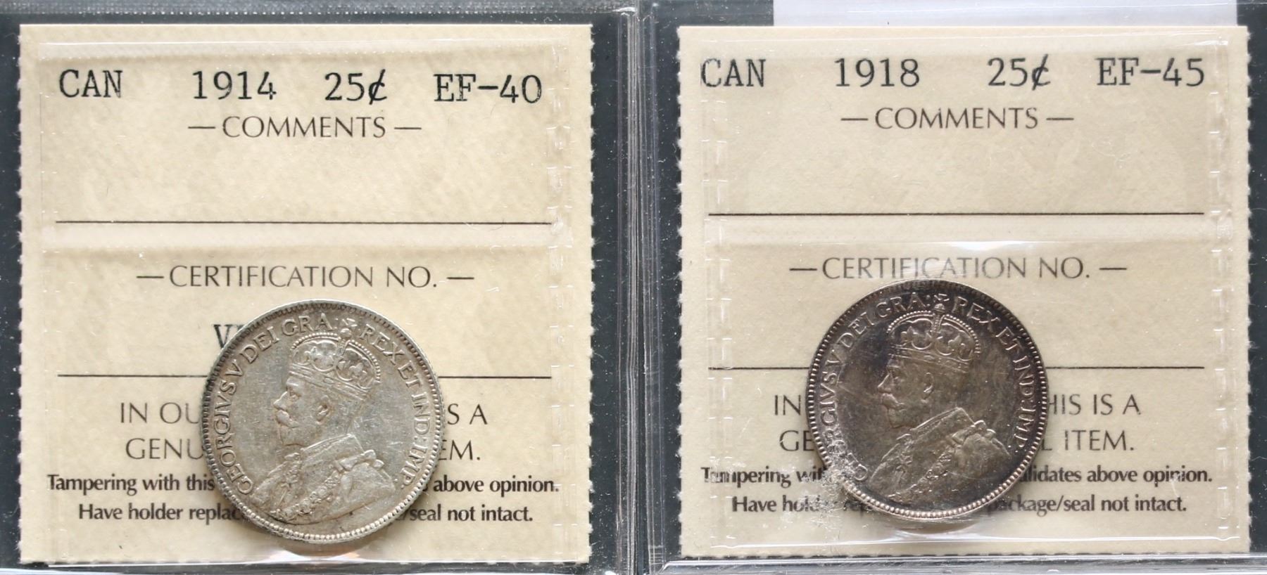 1914 25¢ Extra Fine-40 & 1918 Choice Extra Fine-45. Lot of 2 ICCS graded coins.