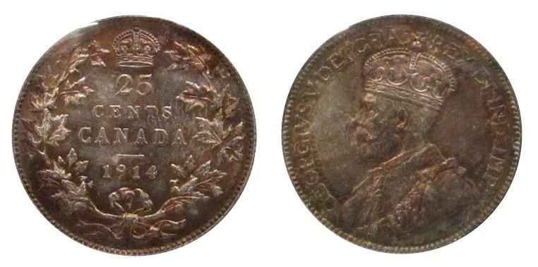 1914 25¢ ICCS MS64. Intense shades of Autumn over full underlying lustre. A nice example.