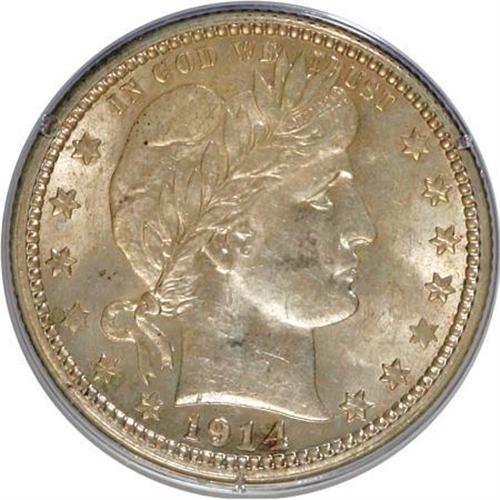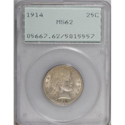 <B>1914 25C MS62 PCGS.</B></I> PCGS Population (65/335). NGC Census: (68/303). Mintage: 6,244,610. Numismedia Wsl. Price for NGC/PCGS coin in MS62: $150. (#5667)<BR><BR><B>Coin Engraver:</B> Charles E. Barber<BR><BR><b>Shipping:</b> Coins & Currency (<a target="_blank" href="http://www.heritageauctions.com/common/shipping.php">view shipping information</a>)