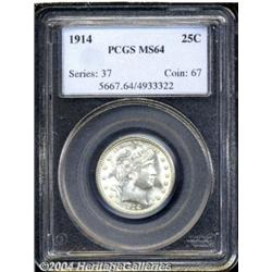 <B>1914<25C> MS64 PCGS.</B></I> Essentially untoned with thick, frosty luster and only a few minor facial ticks that hold this popular type coin to a Choice rating. Population: 115 in 64, 65 finer (3/04).<BR><I>Ex: Exclusive Internet #22033 (Heritage, 3/02), lot 15171, which realized $357.</B></I><BR><I>From the JFS Collection.</B></I> <BR><BR><B>Important notice:</B> Heritage usually auctions material at the rate of 200-250 lots per hour. On some occasions eBay Live bid software or the Internet may not be able to keep up with the pace of the auction. We recommend placing a realistic absentee bid now as insurance to avoid disappointment. Occasionally the auctioneer may eliminate or reject an eBay Live bid, and the auctioneer may also reopen a lot after the close of the eBay live bidding (usually because we missed an audience bid), and may reject your bid even if it shows you as the winning bidder. By bidding via eBay Live, you agree that Heritage may award the lot to another bidder at its sole discretion under the circumstances described above or any other reasonable circumstances. Since eBay bids are not shown to us until we open the lot on the floor, we treat those bids just like floor bids. In most cases the floor responds before the eBay bid is presented to us, due to Internet lag time, so for consistency we have made it a policy that floor bids are always considered first over tie eBay live bids. Also please note that all Heritage lots purchased through eBay Live carry a 20% Buyer's Premium. Please make sure you read the Terms and Conditions before you bid. </span></font></tr></table></td></tr></table>