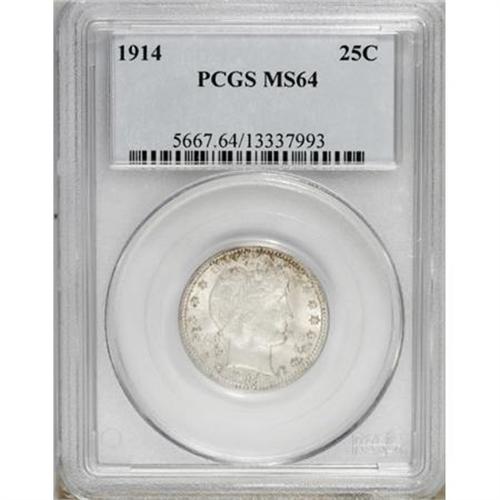 <B>1914 25C MS64 PCGS.</B></I> PCGS Population (135/82). NGC Census: (135/64). Mintage: 6,244,610. Numismedia Wsl. Price for NGC/PCGS coin in MS64: $460. (#5667)<BR><BR><B>Coin Engraver:</B> Charles E. Barber<BR><BR><b>Shipping:</b> Coins & Currency (<a target="_blank" href="http://www.heritageauctions.com/common/shipping.php">view shipping information</a>)