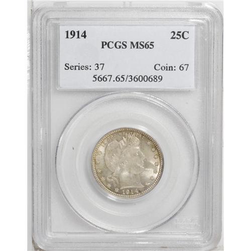 <B>1914 25C MS65 PCGS.</B></I> The frosty luster on the reverse of this Gem has two breaks in the stars above the eagle. Sharply defined with peach, rose, and cerulean patina. Population: 62 in 65, 21 finer (8/06).<BR><I>From The Jones Beach Collection.</B></I><BR><BR><b>Shipping:</b> Coin/Currency (<a target="_blank" href="http://www.heritageauctions.com/common/shipping.php">view shipping information</a>)