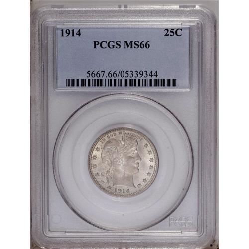 <B>1914<25C> MS66 PCGS.</B></I> Medium dove-gray, olive, and russet patination graces this satiny high grade type coin. A few tiny marks on the cheekbone, but generally well preserved. The strike is complete save for slight softness on the base of the fletchings. Population: 19 in 66, 2 finer (1/06).