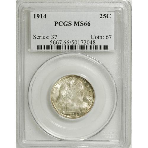 <B>1914 25C MS66 PCGS.</B></I> Silver-gray lustrous surfaces display speckles of olive color. The design elements are adequately struck, save for some of the star centers and the corners of the shield. Population: 19 in 66, 2 finer (2/07).<BR><BR><b>Shipping:</b> Coins & Currency (<a target="_blank" href="http://www.heritageauctions.com/common/shipping.php">view shipping information</a>)