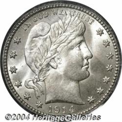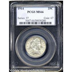 <B>1914<25C> MS66 PCGS.</B></I> Especially well preserved for this late-date Barber issue, with excellent sharpness and ample mint frost clearly on display over untoned surfaces. Several pinpoint facial marks are noticeable, but only upon close inspection. Population: 11 in 66, 1 finer (3/04).<BR><I>Ex: FUN Signature Sale (Heritage, 1/04), lot 6108, which realized $1,725.</B></I><BR><I>From the JFS Collection.</B></I> <BR><BR><B>Important notice:</B> Heritage usually auctions material at the rate of 200-250 lots per hour. On some occasions eBay Live bid software or the Internet may not be able to keep up with the pace of the auction. We recommend placing a realistic absentee bid now as insurance to avoid disappointment. Occasionally the auctioneer may eliminate or reject an eBay Live bid, and the auctioneer may also reopen a lot after the close of the eBay live bidding (usually because we missed an audience bid), and may reject your bid even if it shows you as the winning bidder. By bidding via eBay Live, you agree that Heritage may award the lot to another bidder at its sole discretion under the circumstances described above or any other reasonable circumstances. Since eBay bids are not shown to us until we open the lot on the floor, we treat those bids just like floor bids. In most cases the floor responds before the eBay bid is presented to us, due to Internet lag time, so for consistency we have made it a policy that floor bids are always considered first over tie eBay live bids. Also please note that all Heritage lots purchased through eBay Live carry a 20% Buyer's Premium. Please make sure you read the Terms and Conditions before you bid. </span></font></tr></table></td></tr></table>