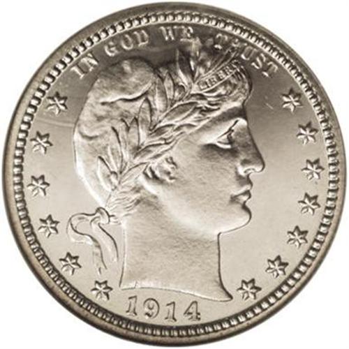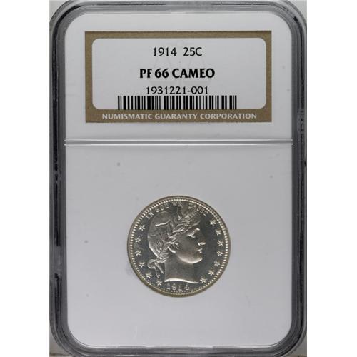 <B>1914 25C PR66 Cameo NGC.</B></I> Not only does the 1914 quarter boast the lowest proof mintage of any Barber quarter (380 pieces), but survivors rarely exhibit sufficient contrast to warrant a Cameo designation. This pinpoint-sharp Premium Gem has good field reflectivity and only a whisper of golden toning. Census: 8 in 66 Cameo, 4 finer (3/07).<BR><BR><b>Shipping:</b> Coins & Currency (<a target="_blank" href="http://www.heritageauctions.com/common/shipping.php">view shipping information</a>)