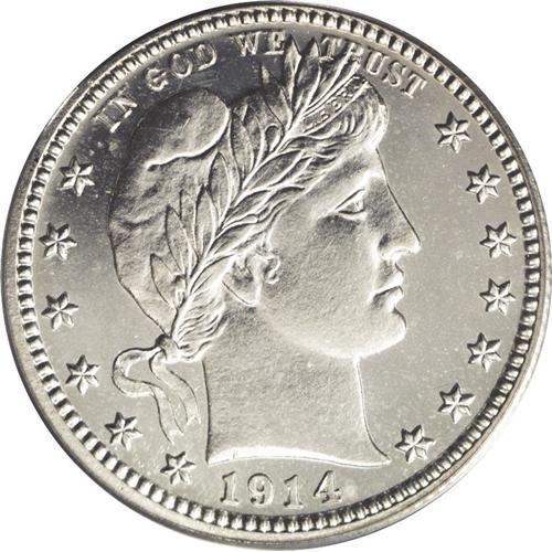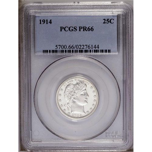 <B>1914<25C> PR66 PCGS.</B></I> The 1914 has the lowest mintage of any proof issue in the Barber quarter series with only 380 pieces produced. This Premium Gem example has unfathomably deep mirrors in the fields with only the slightest hint of mint frost on the devices. Approaching technical perfection, the surfaces are fully brilliant. A single tiny luster graze is noted on Liberty's upper cheek. Population: 17 in 66, 15 finer (4/06).
