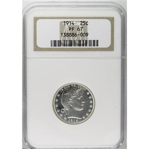 <B>1914 25C PR67 NGC.</B></I> A hint of gold on the obverse devices is the only color on this deeply mirrored example that displays modest contrast. Hardly any flaws are visible in the fields, though a couple of scarcely discernible grazes on Liberty's cheek keep this Superb Gem from an even higher grade. Census: 17 in 67, 7 finer (10/06).<BR><I>From The Jones Beach Collection.</B></I><BR><BR><b>Shipping:</b> Coin/Currency (<a target="_blank" href="http://www.heritageauctions.com/common/shipping.php">view shipping information</a>)