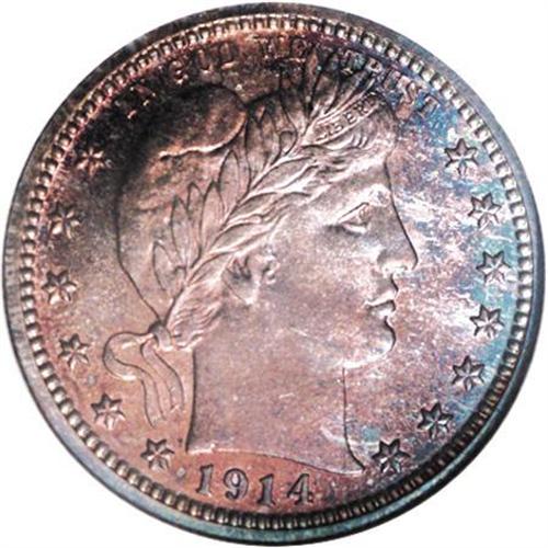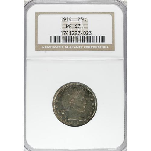 <B>1914 25C PR67 NGC.</B></I> Orange-gold and rose-red centers are bounded by iridescent ocean-blue and plum toning. This exquisitely struck and splendidly unperturbed Superb Gem will satisfy the demanding specialist. The mintage of 380 pieces is easily the lowest of the proof type. Census: 17 in 67, 7 finer (4/07).<BR><BR><b>Shipping:</b> Coins & Currency (<a target="_blank" href="http://www.heritageauctions.com/common/shipping.php">view shipping information</a>)