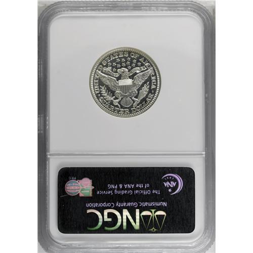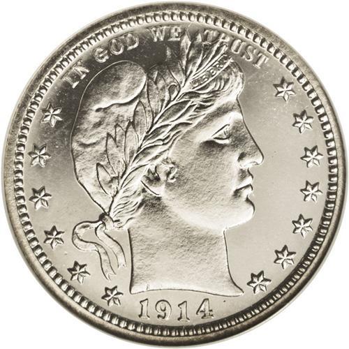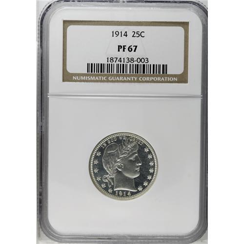 <B>1914<25C> PR67 NGC.</B></I> The 1914 proof quarter is distinctive because of its low mintage of only 380 pieces. This piece is surely at the top of those that survive of this scarce issue. The hairline-free example we offer here has deeply mirrored fields with lightly lustrous devices that yield a subtle cameo effect. This field-to-device contrast is evident, especially due to the coin's brilliant, untoned appearance. For pedigree purposes, a thin slidemark is visible (at certain angles) near the corner of Liberty's mouth. Census: 18 in 67, 7 finer (6/06).<BR><I>From The Mulholland Collection.</B></I>