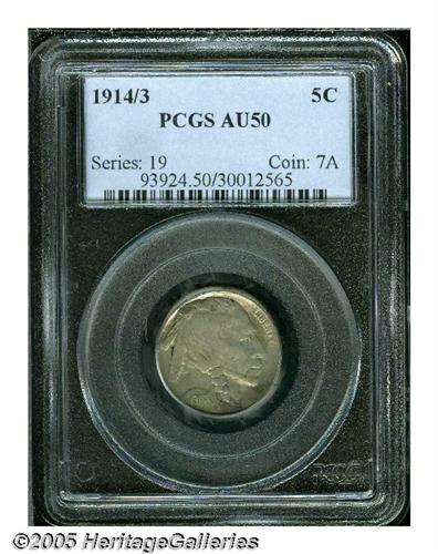 <B>1914/3<5C> AU50 PCGS.</B></I> FS-014.87. It is believed that the overdate feature was impressed into one of the working hubs in 1914, and perhaps two distinct dies were produced from this hub. If that is indeed the case, apparently very few coins were struck from these working dies as there are only a few dozen pieces known in all grades, eight years after the initial discovery. The satiny surfaces show an overlay of streaky russet toning, on each side, and there are only the slightest abrasions present. Minor wear seems evident on some of the highpoints.