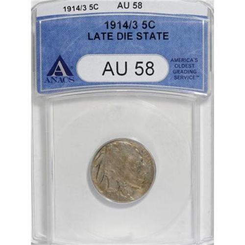 <B>1914/3 5C AU58 ANACS.</B></I> FS-014.87. Late Die State. This is an attractive AU representative with a satiny appearance and light greenish coloration with a few minor toning streaks. Abrasions are nonexistent on both sides. Relatively few examples of this subtle overdate variety have been authenticated by NGC, PCGS and ANACS. <BR><BR><b>Shipping:</b> Coins & Currency (<a target="_blank" href="http://www.heritageauctions.com/common/shipping.php">view shipping information</a>)