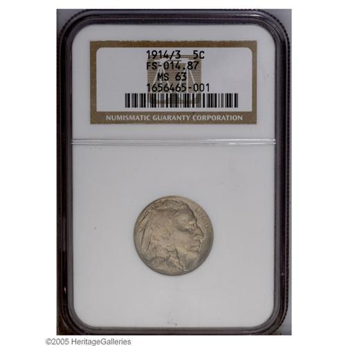 <B>1914/3<5C> MS63 NGC.</B></I> FS-014.87.This is a pleasing Mint State representative with dove-gray patina and golden overtones that are more prominent on the reverse. The strike is not full, yet there are no areas of bothersome incompleteness of detail. Die clash marks (as struck) are evident on the obverse. The 1914/3 is a recently discovered overdate nickel variety that remains particularly elusive in Mint State. Population: 12 in 63, 11 finer (10/05).