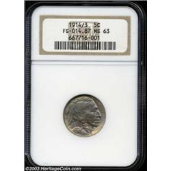 <table><tr><td><TABLE cellSpacing=0 cellPadding=0 width="100%" bgColor=#000000 border=0><TBODY> <TR><TD width="100%"><TABLE cellSpacing=1 cellPadding=3 width="100%" border=0><TBODY><TR><TD width="100%" bgColor=#79735c><FONT face=arial color=#ffffff size=3><B>Description</B> </FONT></TD></TR><TR><TD width="100%" bgColor=#ffffff><FONT face=arial size=2><B>1914/3 5C MS63 NGC.</B></I> FS-14.87. Streaks of olive, gold, and rose patina visit this nicely struck and well preserved example. The Indian has clashmarks (as made) beneath his chin from E PLURIBUS UNUM on the opposite side, and a faint retained lamination (as produced) is nearby at 5 o'clock. This interesting variety was first reported in early 1997, and made its initial <I>Cherrypickers'</B></I> appearance in the fourth edition (2000). A similar 1914/3-S variety (FS-14.89) is also known, although a 1914/3-D has yet to be discovered. Population: 7 in 63, 8 finer (9/03). </FONT></TD></TR></TBODY></TABLE></TD></TR></TBODY></TABLE><BR><A name=PricesRealized></A><TABLE cellSpacing=0 cellPadding=0 width="100%" bgColor=#000000 border=0><TBODY><TR><TD width="100%"><TABLE cellSpacing=1 cellPadding=3 width="100%" border=0><TBODY><TR><TD width="100%" bgColor=#79735c><A name=PR><FONT face=arial color=#ffffff size=3><B>Previous Prices from Heritage Auctions</B> </FONT></A></TD></TR><TR><TD bgColor=#f6f6ed><TABLE cellSpacing=0 cellPadding=0 width="100%" border=1><TBODY><TR><TD align=middle width="33%"><B>Date</B></TD><TD align=middle width="33%"><B>Service</B></TD><TD align=middle width="33%"><B>Price</B></TD></TR><TR bgColor=whitesmoke><TD width="33%"><B>07/30/2002</B></TD><TD width="33%">NGC</TD><TD width="33%">$2,760.00</TD></TR><TR bgColor=whitesmoke><TD width="33%"><B>01/10/1998</B></TD><TD width="33%">NGC</TD><TD width="33%">$5,520.00</TD></TR><TR bgColor=whitesmoke><TD width="33%"><B>02/16/2000</B></TD><TD width="33%">PCGS</TD><TD width="33%">$4,313.00</TD></TR></TBODY></TABLE></TD></TR><TR><TD bgColor=#ffffff><FONT face=arial size=1 ?>PLEASE NOTE: All prices realized reflect the final hammer price PLUS the buyer's premium in auctions that charge a buyer's premium. Each item has a notation at the top of the listing indicating whether that lot included a buyer's premium. Example: A item that sells with a final hammer price of $100 and a 20% buyer's premium will display with a price realized of $120. All information listed is intended to be as accurate as possible, but errors are possible. Please use this guide carefully and inform us of any inaccuracies. </FONT></TD></TR></TBODY></TABLE></TD></TR></TBODY></TABLE><BR><TABLE cellSpacing=0 cellPadding=0 width="100%" bgColor=#000000 border=0><TBODY><TR><TD width="100%"><TABLE cellSpacing=1 cellPadding=3 width="100%" border=0><TBODY><TR><TD width="100%" bgColor=#79735c colSpan=6><FONT face=arial color=#ffffff size=3><B>Price Guide*</B> </FONT></TD></TR><TR bgColor=#f6f6ed><TD align=middle><B>Grade</B> </TD><TD align=middle><B>Coin World<BR>(Trends)</B> </TD><TD align=middle><B>Numismedia<BR>Retail</B> </TD><TD align=middle><B>Numismedia<BR>Wholesale</B> </TD><TD align=middle><B>Coin<BR>Universe</B> </TD><TD align=middle><B>Heritage<BR>Value Index</B> </TD></TR><TR bgColor=#ffffff><TD align=middle>62</TD><TD align=right>---</TD><TD align=right>---</TD><TD align=right>$2,950.00</TD><TD align=right>---</TD><TD align=right>$3,472.78</TD></TR><TR style="FONT-WEIGHT: bold" bgColor=#cccfdd><TD align=middle>63</TD><TD align=right>$5,000.00</TD><TD align=right>---</TD><TD align=right>$7,475.00</TD><TD align=right>$8,000.00</TD><TD align=right>$4,550.00</TD></TR><TR bgColor=#ffffff><TD align=middle>64</TD><TD align=right>---</TD><TD align=right>---</TD><TD align=right>$11,500.00</TD><TD align=right>---</TD><TD align=right>$25,550.00</TD></TR><TR bgColor=#ffffff><TD colSpan=6><FONT size=1>*All information listed is intended to be as accurate as possible, but errors are possible. No item may be returned or refused based on this information which is provided as a service to our customers. You should contact each pricing source directly to determine the accuracy of this information. </FONT></TD></TR></TBODY></TABLE></TD></TR></TBODY></TABLE><BR><TABLE cellSpacing=0 cellPadding=0 width="100%" bgColor=#000000 border=0><TBODY><TR><TD width="100%"><TABLE cellSpacing=1 cellPadding=3 width="100%" border=0><TBODY><TR><TD width="100%" bgColor=#79735c><FONT face=arial color=#ffffff size=3><B>Population Guide</B> </FONT></TD></TR><TR bgColor=#ffffff><TD align=middle><!-- Begin Output of Population Grid--><TABLE cellSpacing=0 cellPadding=0 width="100%" border=0><TBODY><TR><TD vAlign=center><TABLE cellSpacing=0 width="100%" border=1 cellsadding="3"><TBODY><TR><TD vAlign=center><TABLE cellSpacing=0 cellPadding=3 width="100%" border=1><TBODY><TR><TD vAlign=center align=middle bgColor=#f0f1e8 colSpan=2 <CENTER><FONT face=Arial size=2><B>PCGS Pop </B></FONT><CENTER></CENTER></TD><TD vAlign=center align=middle bgColor=#f0f1e8 colSpan=2><CENTER><FONT face=Arial size=2><B>NGC Pop</B></CENTER></FONT></TD></TR><TR><TD vAlign=center><FONT face=Arial size=2>(63)</FONT> </TD><TD vAlign=center align=right><FONT face=Arial size=2>9</FONT> </TD><TD vAlign=center><FONT face=Arial size=2>(63)</FONT> </TD><TD vAlign=center align=right><FONT face=Arial size=2>0</FONT> </TD></TR><TR><TD vAlign=center><FONT face=Arial size=2>(>63)</FONT> </TD><TD vAlign=center align=right><FONT face=Arial size=2>13</FONT> </TD><TD vAlign=center><FONT face=Arial size=2>(>63)</FONT> </TD><TD vAlign=center align=right><FONT face=Arial size=2>0</FONT> </TD></TR></TBODY></TABLE></TD></TR></TBODY></TABLE></TD></TR></TBODY></TABLE><!-- End Output of Population Grid--></TD></TR></TBODY></TABLE></TD></TR></TBODY></TABLE><BR><TABLE cellSpacing=0 cellPadding=0 width="100%" bgColor=#000000 border=0><TBODY><TR> Important notice: Heritage usually auctions material at the rate of 200-250 lots per hour. On some occasions eBay Live bid software or the Internet may not be able 