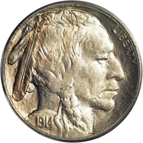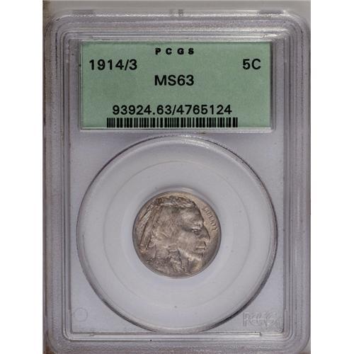 <B>1914/3<5C> MS63 PCGS.</B></I> FS-014.87. Lange's Buffalo nickel reference points out that the dual date likely stems from a working hub, since two or three different dies have been uncovered with the overdate feature since its initial discovery. The underdigit 3 is clear on both sides of the 4 on this lustrous and pretty example, and the doubling on the other digits is bold. The surfaces are covered in a light gold overlay. A few trivial abrasions on the highpoints determine the grade. This piece has a decent strike and is certified in a green label holder. Population: 9 in 63, 13 finer (4/06).