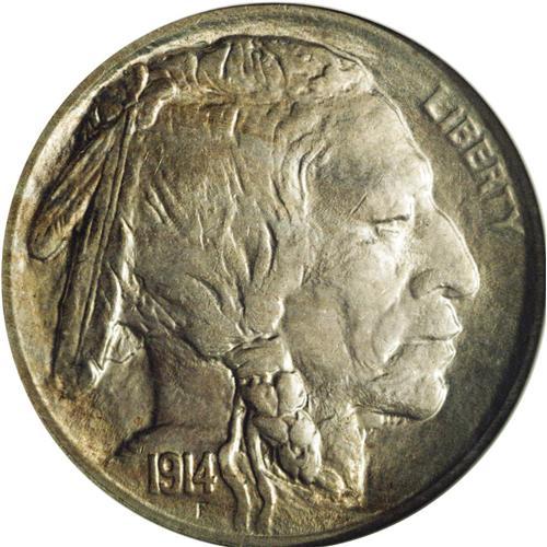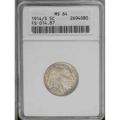 <B>1914/3<5C> MS64 ANACS.</B></I> FS-014.87. An intermediate die state of this recently discovered overdate. The upper horizontal bar of the underdigit is discernible as a thin, straight, raised lump on both sides of the top of the 4. There is equal definition seen on the upper portion of the downstroke of the 3. The overdate is scarce in mint condition with only 50-60 pieces known to date. The surfaces are attractive and the satiny mint luster is covered with mildly iridescent olive-golden patina that deepens slightly around the rims. Sharply struck, only a few small abrasions are noticeable with a loupe and prevent a full Gem grade.