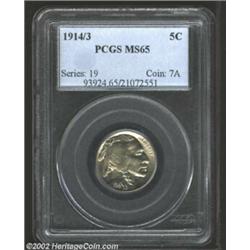 1914/3 5C MS65 PCGS. FS-014.87. This is an interesting overdate for two reasons. First, the overdate feature seems to have been part of a working hub, not a working die because there are several known varieties. Second, the overdate feature remained undiscovered until 1996. Actually, these two facts are somewhat related. The fact that the overdate is part of a working hub means that the coins are actually a third generation copy of this feature. As a result, the 3 underdigit is difficult to discern on even the earliest die states. It is little wonder, therefore, that it remained undetected for 82 years. The 1914/3 is not only a fascinating coin, it is also a rare one. The recent discovery date and the difficulty of attribution mean that it is virtually impossible for us to determine the exact rarity of this variety. What we do know is that PCGS has seen only 24 Mint State examples (10/02). The fact that half of these "coins" are listed at the MS64 level suggest that the same example(s) was/were submitted numerous times in the search for an MS65 designation. One of only two coins at the latter level of preservation, this important Gem displays a mostly silver-gray sheen. Pale gold, champagne, and powder-blue undertones, however, are evident at a few angles. Both sides reveal fulsome mint bloom as the surfaces rotate under the light--a feature that is fully appreciable in the virtual absence of blemishes. A late die state, there are not only some metal flow lines (as struck), but the underdigit is only perceptible as a thin ridge at the top of the 4. Well struck save for a little softness of detail in the centers, the only worthwhile pedigree marker is a tiny, faint carbon fleck in the field below the bison's mouth. We cannot overstate the importance of this coin for advanced Buffalo Nickel collectors.From the BTB Collection of Buffalo Nickels. Important notice: We expect to be auctioning lots at the rate of 200-250 per hour. Sometimes eBay Premier live bid software cannot keep up with that pace, so we strongly recommend that you place a realistic proxy bid now as insurance to avoid disappointment. Also please note that all Heritage/CAA lots purchased through eBay Premier carry a 20% Buyer's Premium. Please make sure you read the Terms and Conditions.