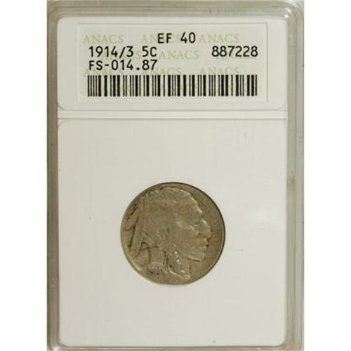 <B>1914/3 5C XF40 ANACS.</B></I> FS-014.87. A moderately circulated slate-gray example of this seldom seen variety. The upper crossbar of the underdigit 3 is faintly evident.<BR><BR><b>Shipping:</b> Coins & Currency (<a target="_blank" href="http://www.heritageauctions.com/common/shipping.php">view shipping information</a>)