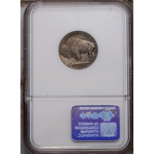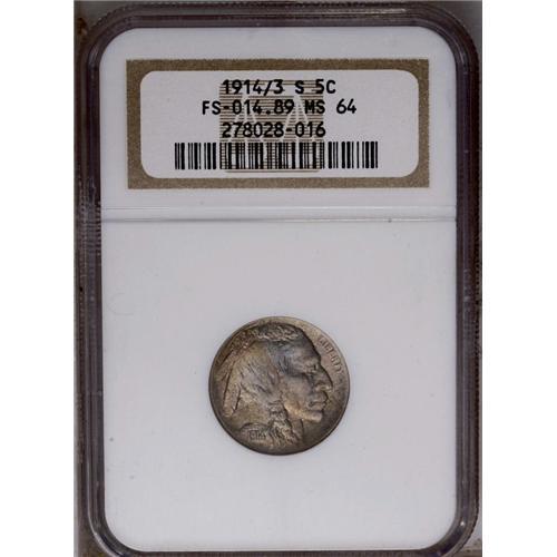 <B>1914/3-S<5C> MS64 NGC.</B></I> FS-014.89. Of the 1914/3-S, David Lange, in his 2000 edition of <I>The Complete Guide to Buffalo Nickels,</B></I> writes that Tom DeLorey turned up the first example of this variety a year or so after the Philadelphia Mint overdate was found (1996). Lange indicates that: "While the P-Mint coins are difficult to identify, the S-Mint edition is extremely so. The horizontal top of numeral 3 is just barely evident on even the sharpest, early-die-state specimens. ... One feature that seems to be present on each 1914/3-S seen thus far is a die crack on its reverse."<BR> The near-Gem specimen presented here displays the very faint straight top bar of the underlying 3 at the top of the 4, and the equally faint start of the 3's diagonal on the upper right outside of the 4. On the reverse, a prominent die crack connects the bison's forehead to the rim, and a faint crack runs along the upper edge of the exergue into which the value FIVE CENTS is placed. While these cracks appear to occur on known examples of this overdate variety, Lange cautions: "... that the presence of these features is not conclusive proof of an overdate. Similar cracks can appear on other dies, and the reverse die used to coin the overdate may have paired at some point with a different obverse."<BR> This example exhibits lustrous surfaces bathed in pastel powder-blue, gold, and lavender patina. The design features are well impressed, and include a bold date and mintmark, a strong LIBERTY, and a sharp horn and tail. Most of the hair on the bison's head shows clearly, as do most of the Indian's feathers and the braid. Neither side reveals significant contact marks or unsightly spots. <BR><BR><B>Important